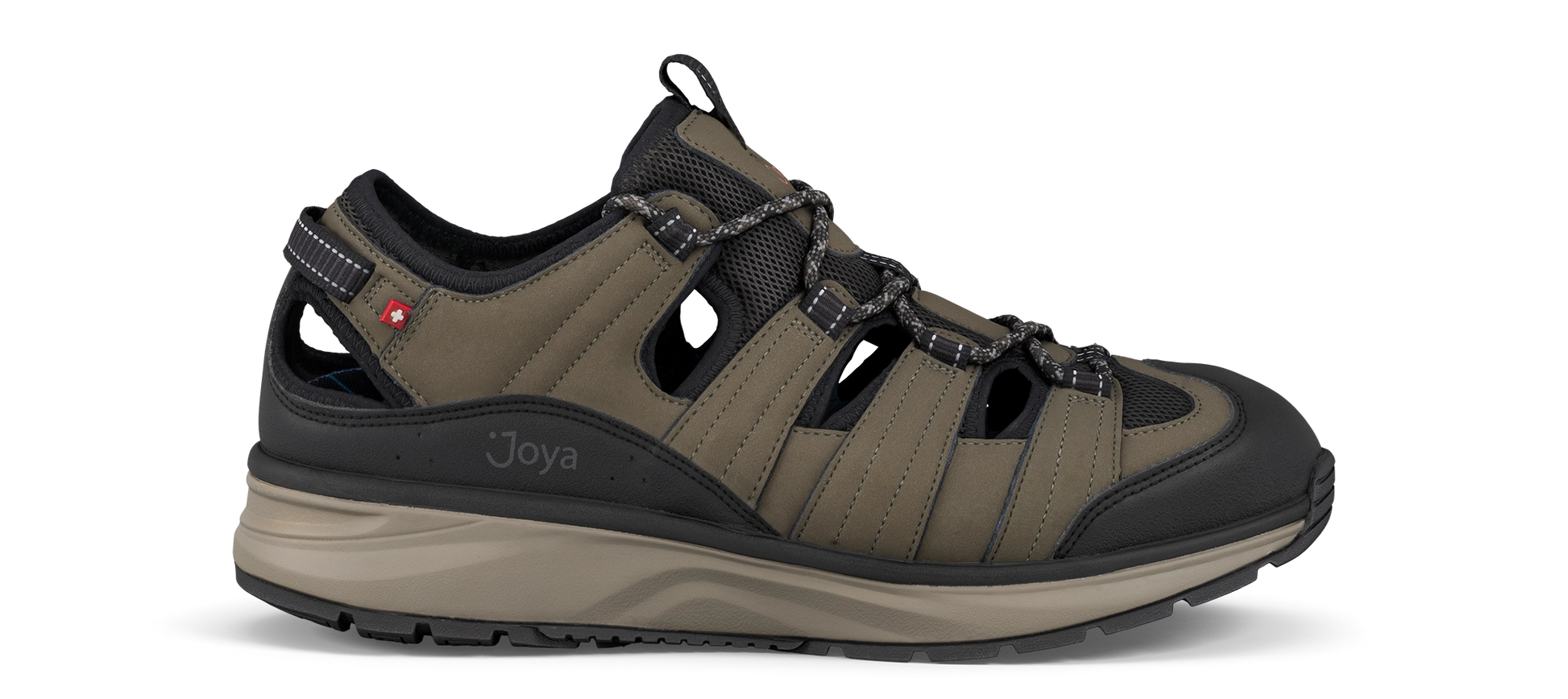 Robuste Nubukleder-Sandale mit geschlossener Zehenpartie, weichem und dehnbarem, gepolstertem Neoprenfutter und Schnürsenkeln zum schnellen und einfachen Anpassen. Äußerst bequem und absolut atmungsaktiv, dank der Belüftungsöffnungen im Obermaterial. Ausgestattet mit der Joya Active Sohlentechnologie, die eine ideale Kombination aus Dämpfung, Rückfederung und Stabilität garantiert. Für dynamische Menschen, die immer in Bewegung sind, die Komfort auf jedem Untergrund brauchen.