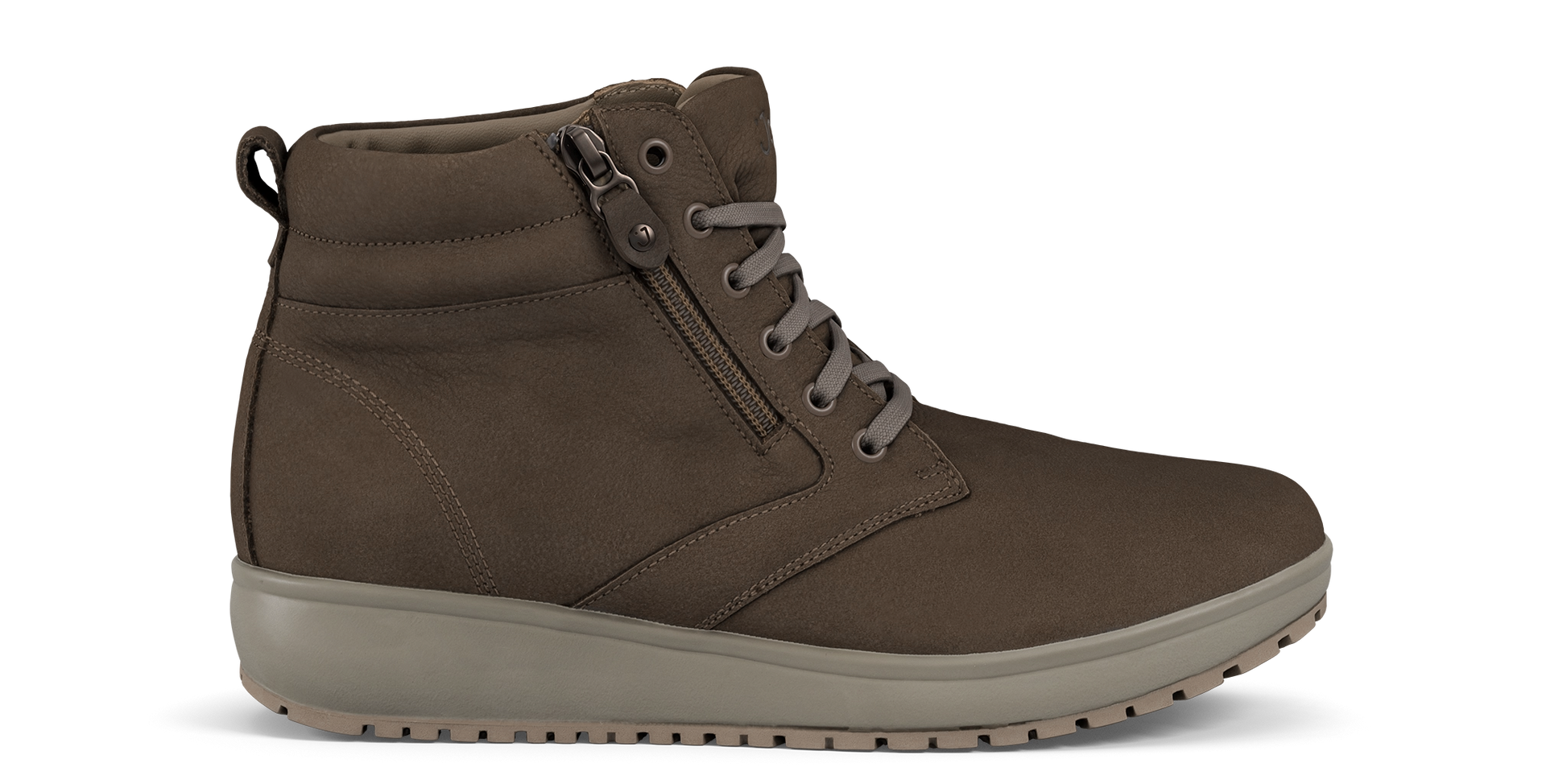 Smart lace up boot with zip for easy entry. Soft and beautiful nubuck leather upper with cushy padded collar. Leather and textile lining. Featured with the Joya Senso sole technology that ensures excellent cushioning effect and balanced pressure distribution, and delivers optimum comfort and relief for your back muscles, joints and feet daily stress.