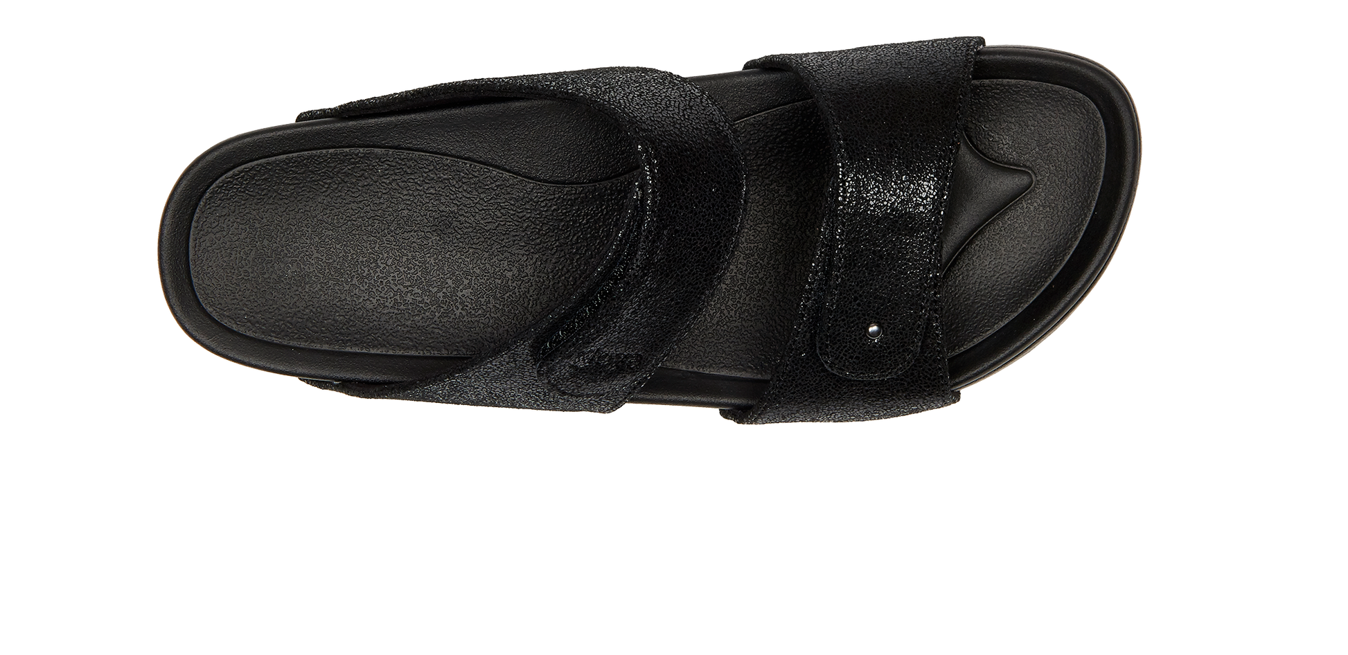 Pantofole in crosta di pelle scintillante e morbida fodera in tessuto. I cinturini regolabili in velcro garantiscono una calzata ottimale. Questa tecnologia presenta un plantare morbido e una suola ampia e morbida, che offre stabilità e ammortizzazione. Adatte a persone con schiena sensibile e con piedi e articolazioni esposti a stress quotidiano.