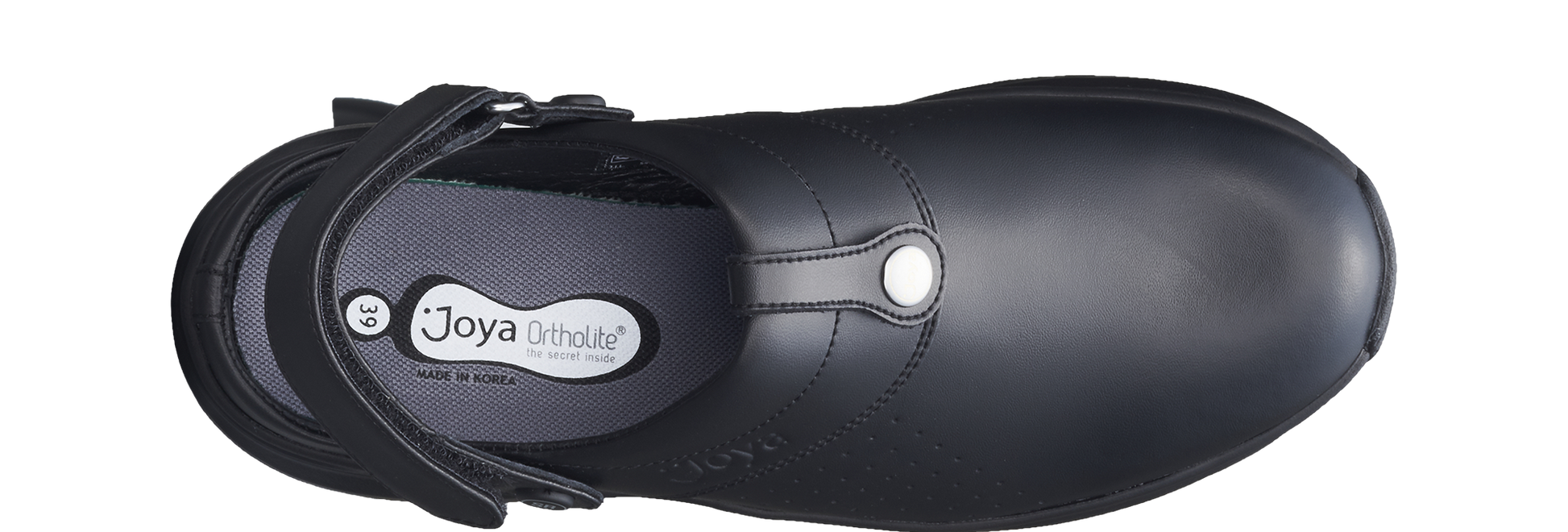 Clog mit verstellbarem Klettverschluss-Rückenriemen, Leder- und Textilfutter, besonders geeignet als Arbeitsschuh. Rutschfeste Sohle für zusätzliche Sicherheit am Arbeitsplatz. Basierend auf der Joya Active Sohlentechnologie, die eine ideale Kombination aus Dämpfung, Rückprall und Stabilität garantiert. Für dynamische Menschen, die Komfort in Bewegung und Leistung auf jedem Untergrund benötigen.